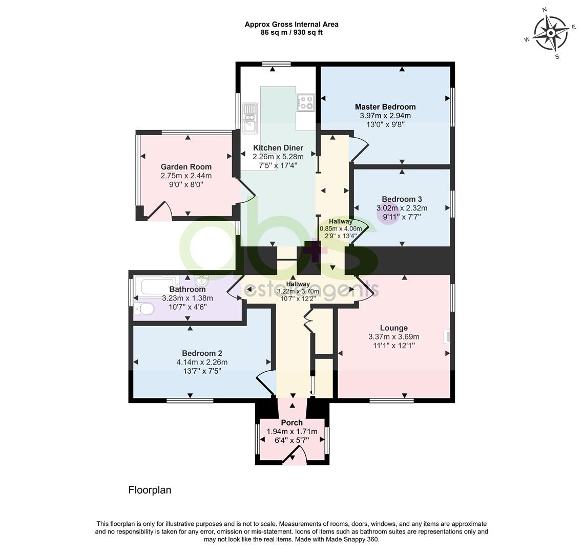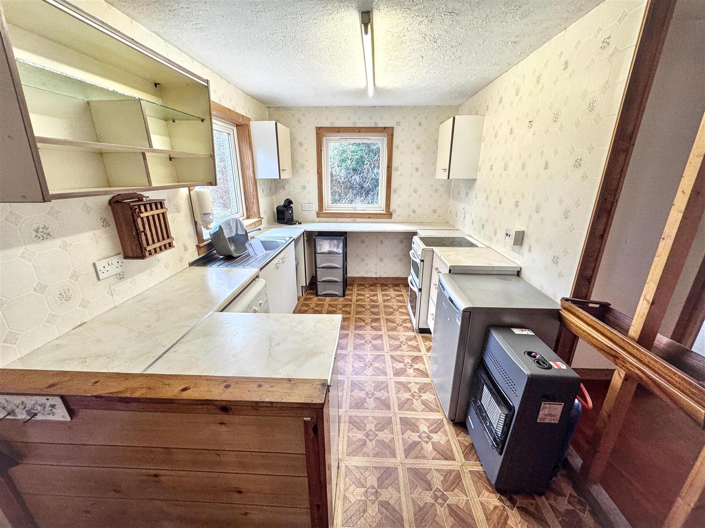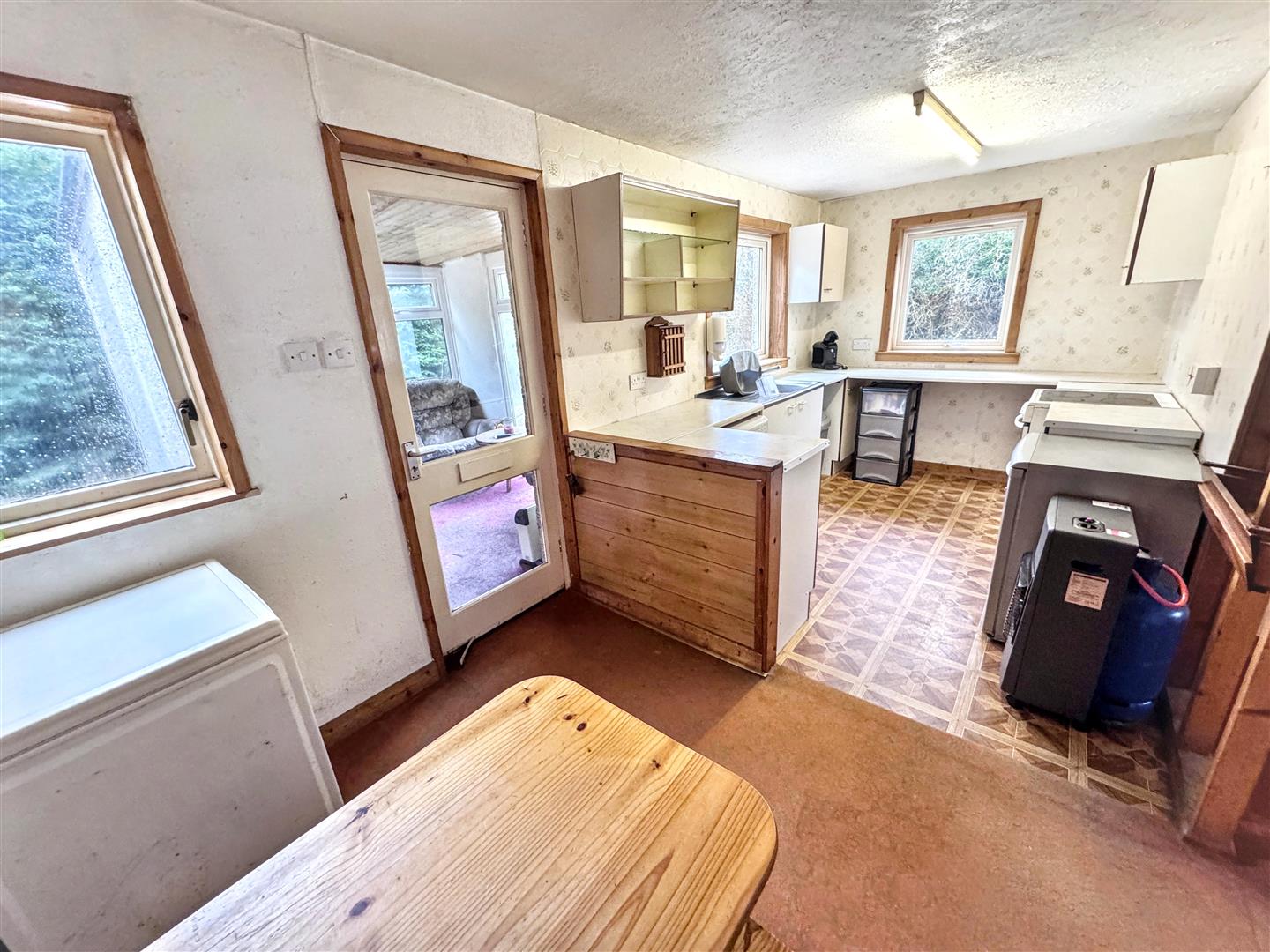 Opening from the hallway to the Kitchen/Diner. Base and wall mounted units with spaces for washing machine, fridge and cooker. One window to the rear and two to the side. Door to Garden Room. Space for dining table and chairs.