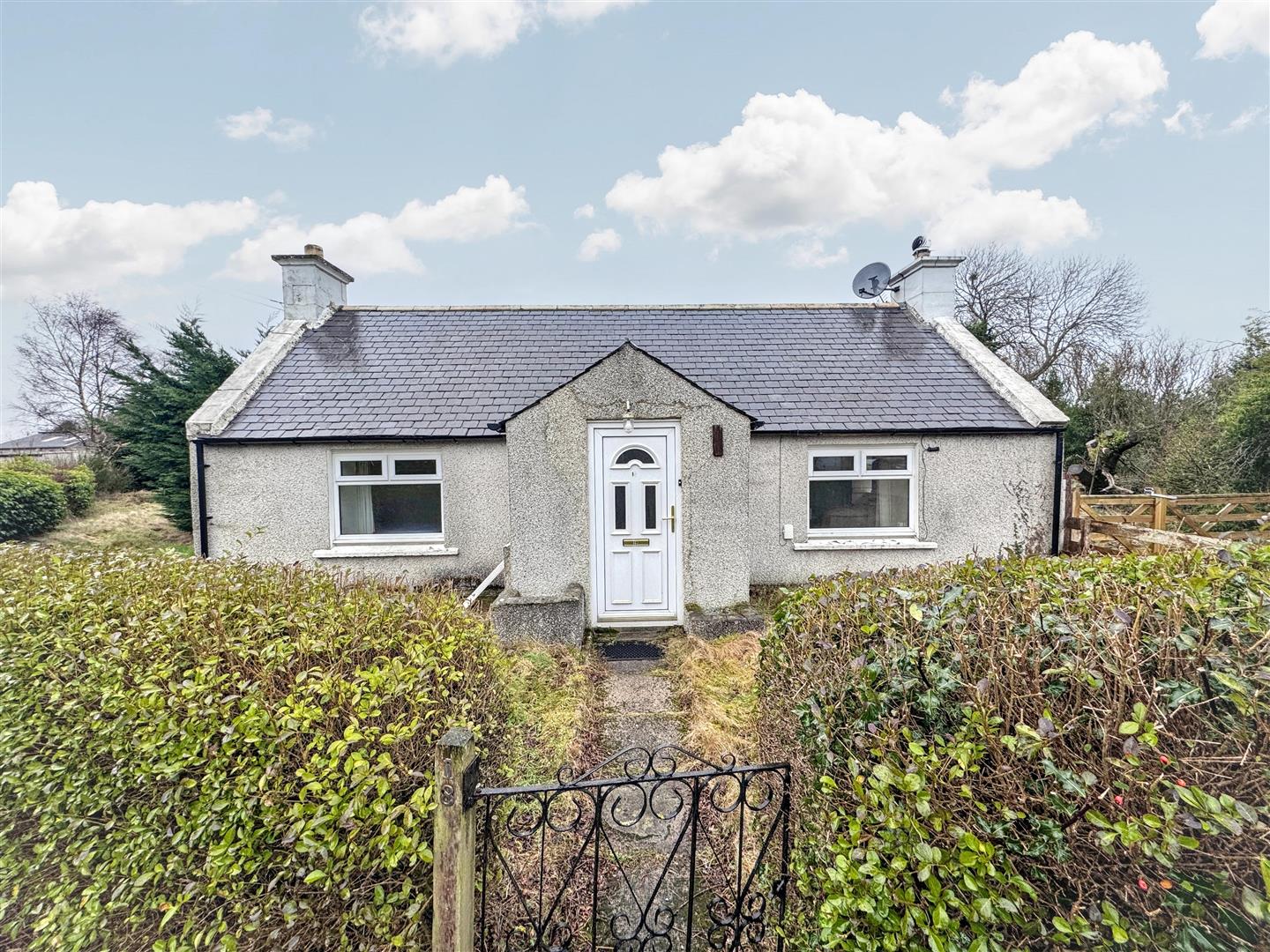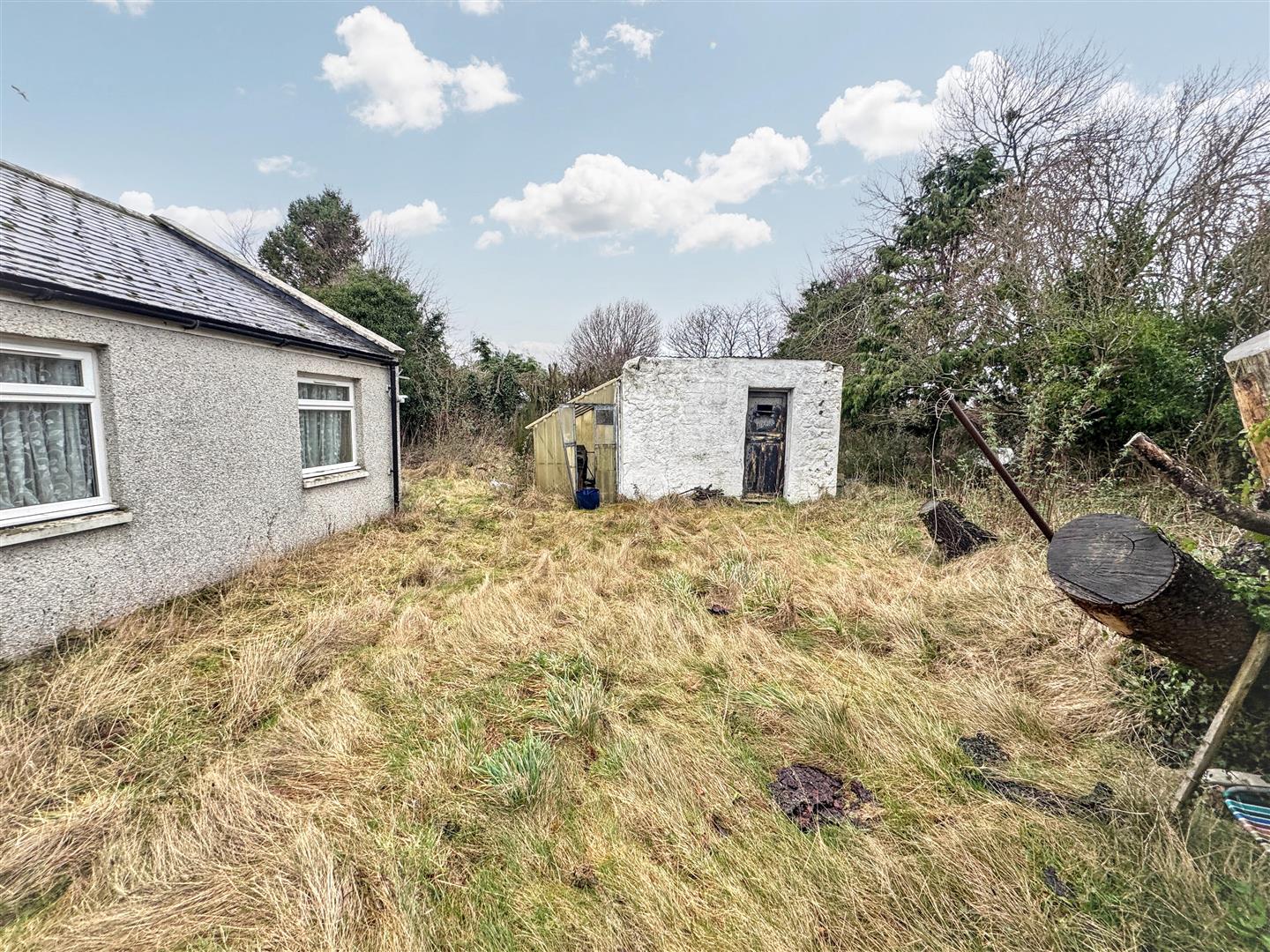 The property is set in a good size plot with areas of lawn, shrubs, trees and a pond. Stone shed and a lean to with corrugated pvc panels, both requiring maintenance. Off street parking.