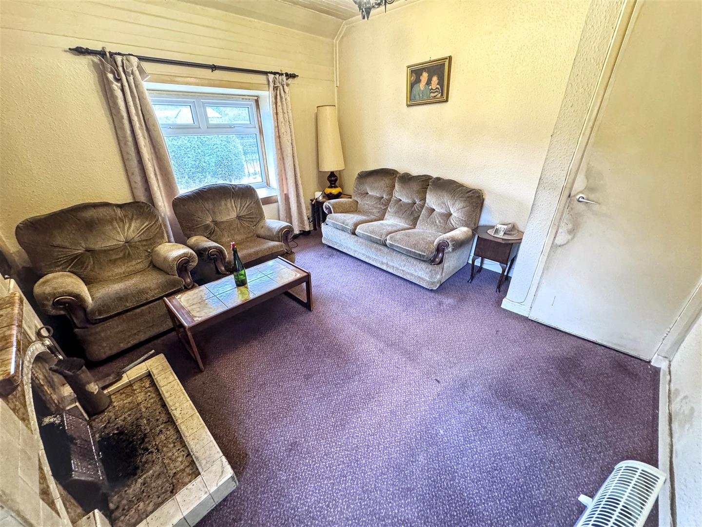 Open fireplace with tiled hearth and surround. Windows to the front and side.