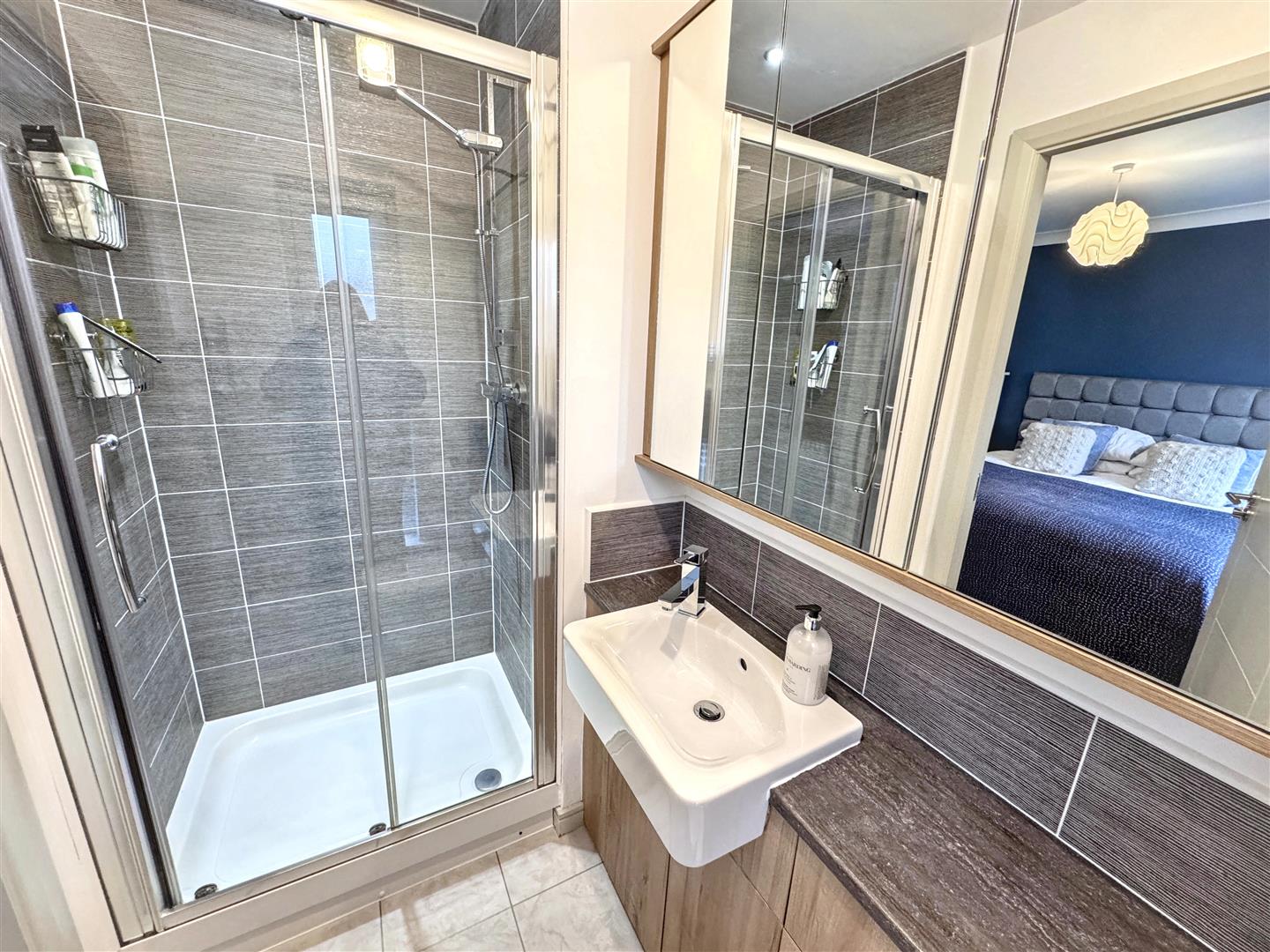 Three piece suite comprising shower cubicle with mains shower, wash basin and WC. Fully tiled in shower and splash back at sink. Opaque window, chrome towel rail radiator and tiled flooring.