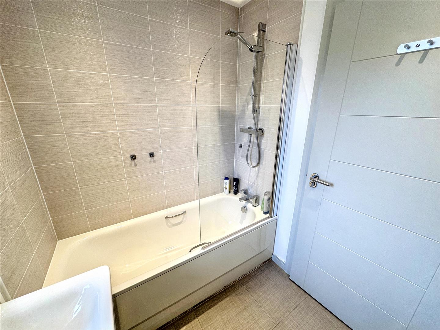Bath with mains shower fitted over and shower screen, WC and wash hand basin. Opaque window to the rear. Medicine cabinet, tiled floor, extractor, recessed spotlights and radiator.