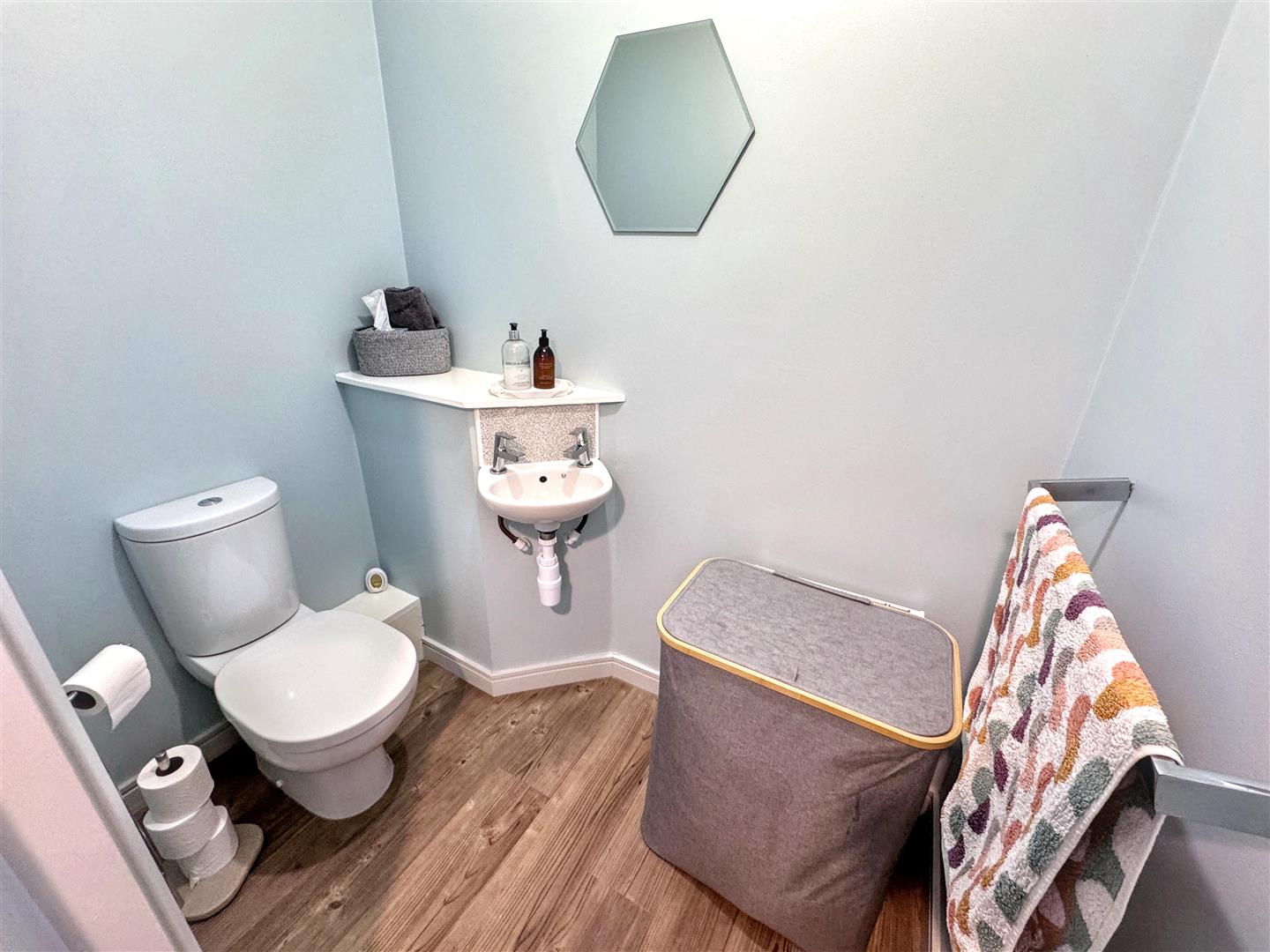 WC and wash hand basin. Ceiling light, extractor, Amtico flooring and radiator.