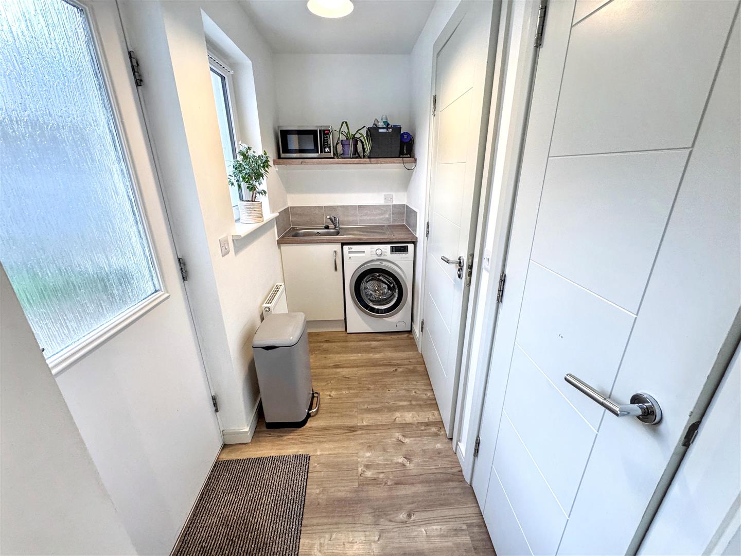 Door and window to rear garden. Sink and drainer. Plumbing for washing machine. Radiator and light fitting. Built-in cupboard.