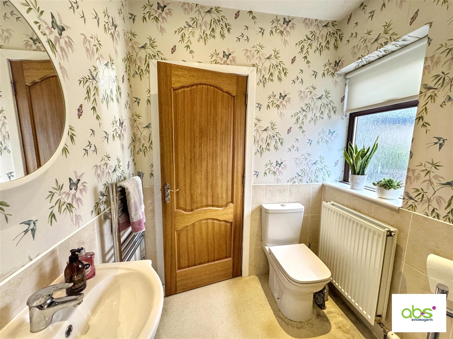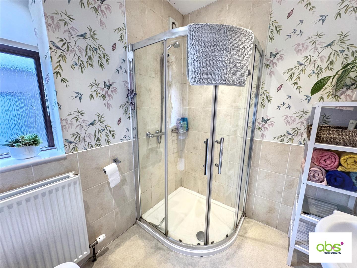 Attractive shower room with tiling to half height and full height within the shower cubicle plus Mains shower. Vanity wash hand basin and wc. Ladder radiator plus rear facing window with radiator below. Recessed ceiling downlights.