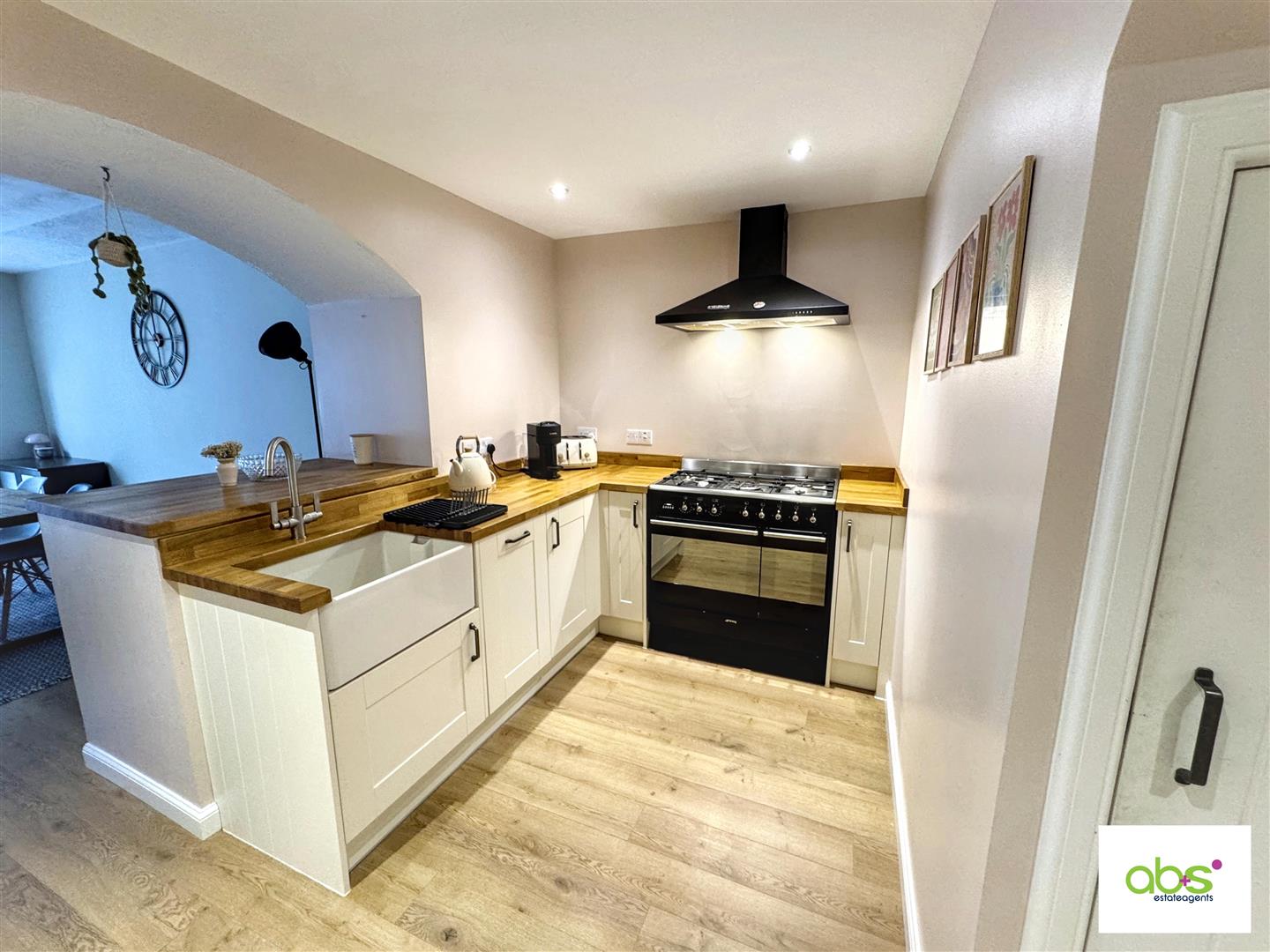 Delightful Kitchen conveniently situated beside the family room. Two section, the first is a range of floor and wall mounted units in cream complimented by beautiful solid wood work surfaces and upstands along with full height fridge/freezer. The second section comprises a range of floor units with lovely deep ceramic Belfast sink. Again the solid wood worktops and upstands as well as integral dishwasher and Range cooker with 5 ring gas hob. Ceiling downlights and laminate wood flooring which extends into the family room. Feature archway opening to the :-