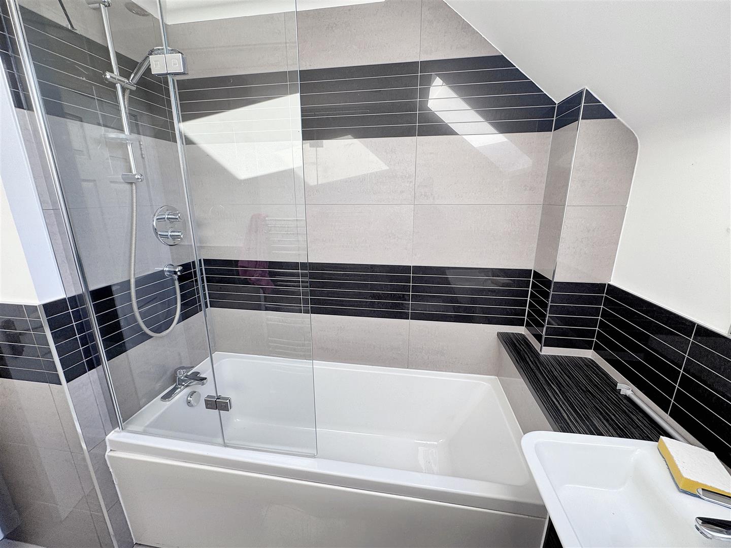 Contemporary bathroom fitted with a bathw with mains shower over head and shower screen in place, wash hand basin set in vanity unit and WC with concealed cistern. Tiling to floor, in the bath area and to dado height on remaining walls. Velux window, chrome towel rail radiator and recessed down lighters.