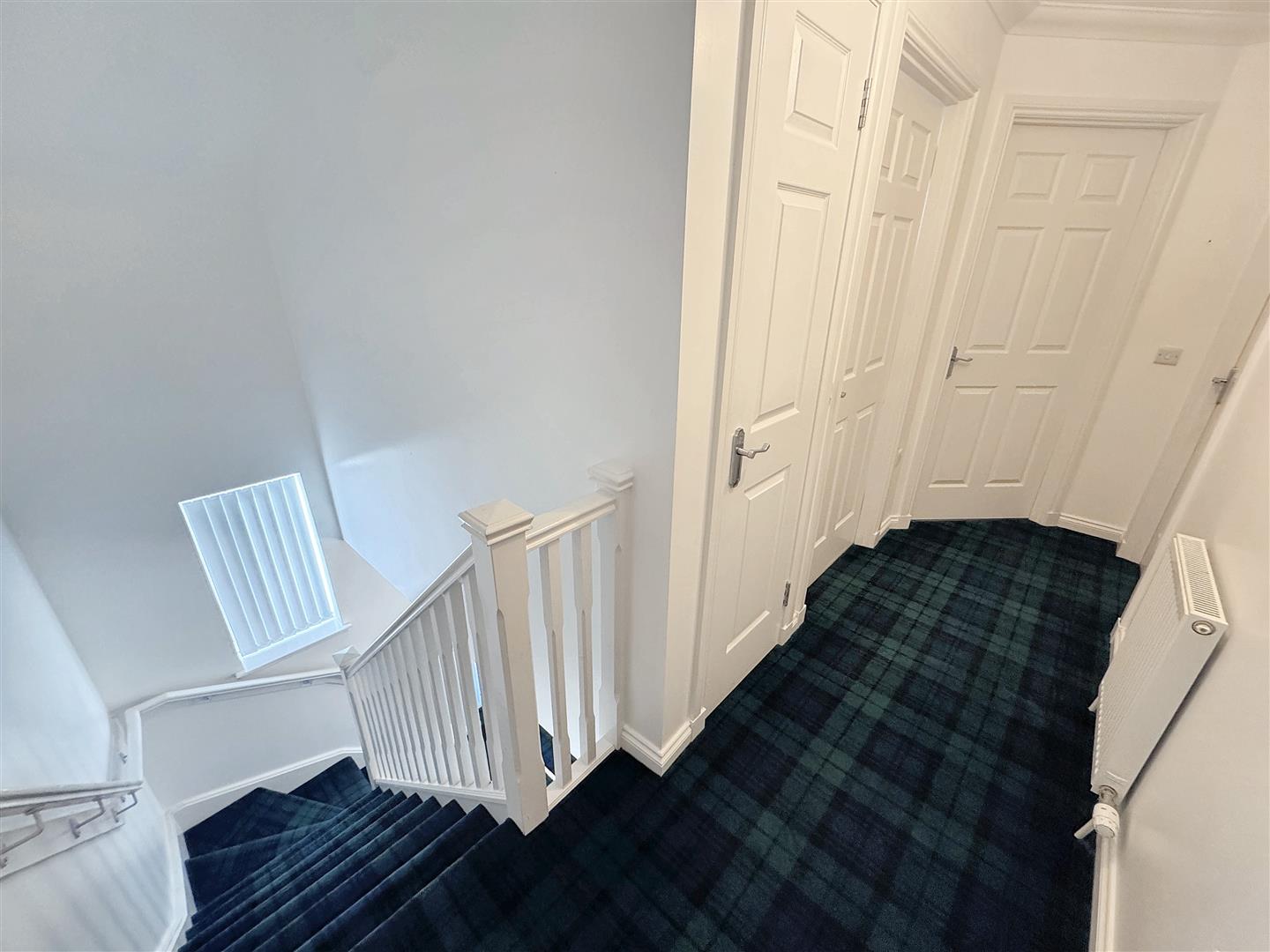 Carpeted staircase with window to the front, leads to the upper floor. Hatch to loft space, radiator and pendant light. Cupboard with shelving. Doors to all bedrooms and bathroom.