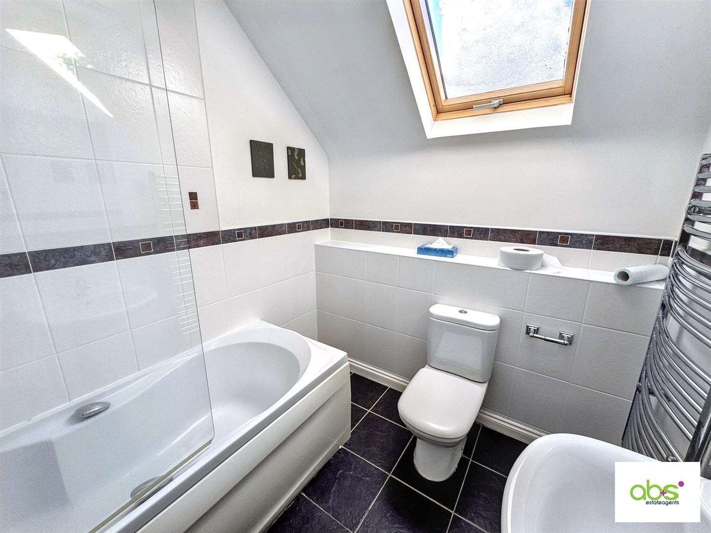 With tiling to half height, bathroom with bath, wc and wash hand basin. Mains shower fitted over the bath with shower screen in place. Part coombe ceiling with Velux window. Ceiling light, Xpelair, ladder radiator and laminate tile flooring.