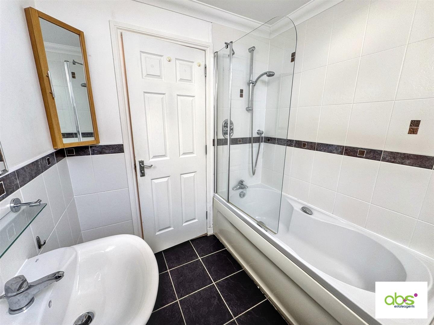 With tiling to half height, bathroom with bath, wc and wash hand basin. Mains shower fitted over the bath with shower screen in place. Part coombe ceiling with Velux window. Ceiling light, Xpelair, ladder radiator and laminate tile flooring.