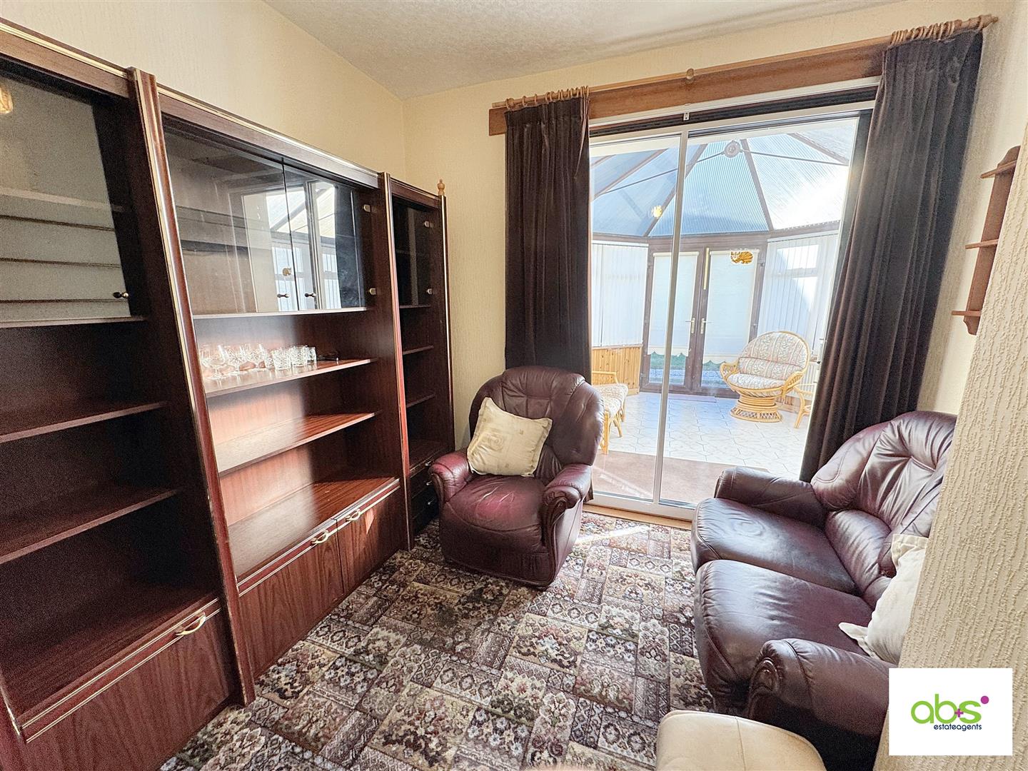 A cosy rear-facing snug with sliding glass doors opening into a bright conservatory.