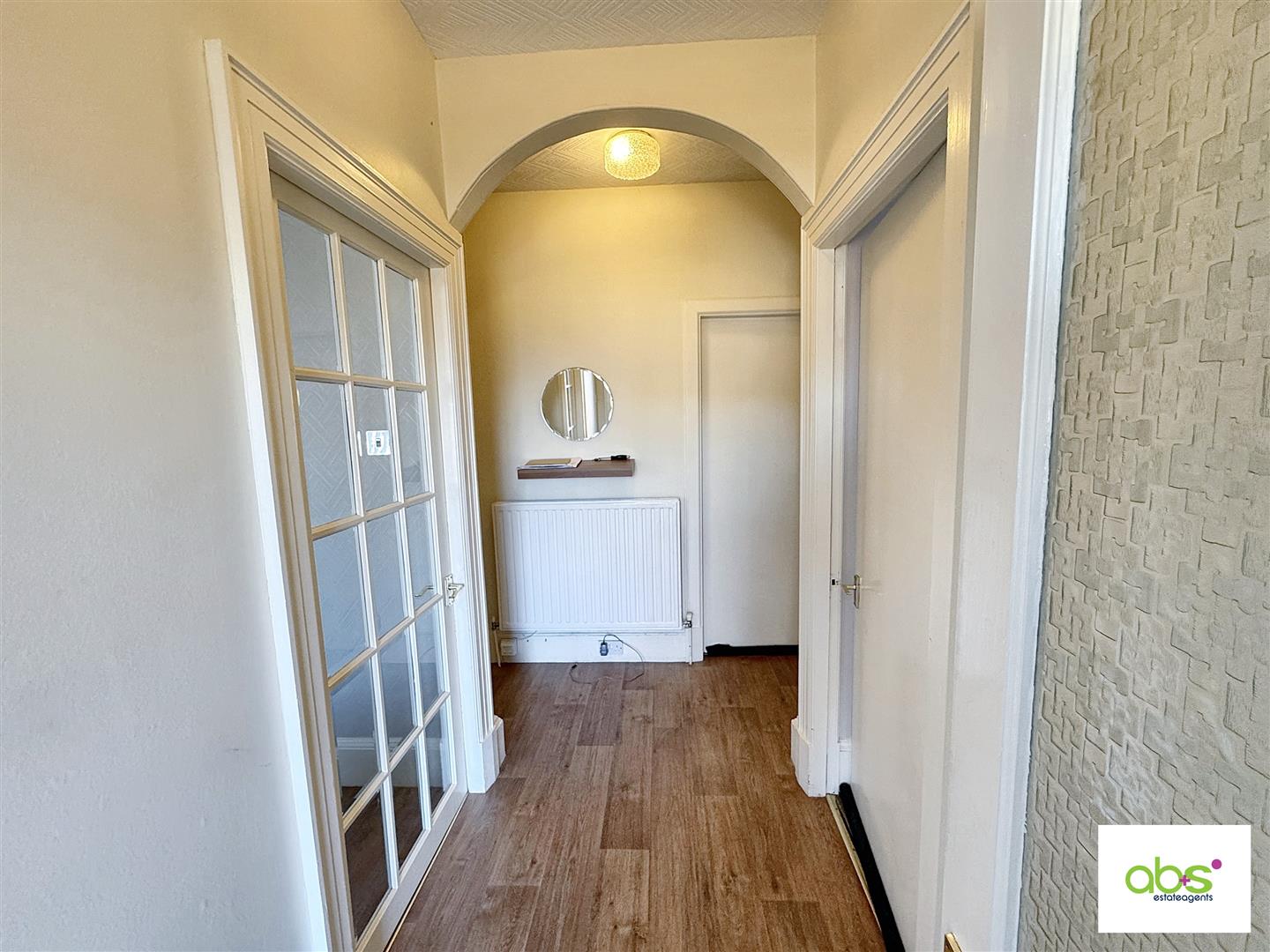 Welcoming entrance space featuring a charming arched ceiling detail, light-toned walls, wood effect flooring, and elegant glass-panelled internal doors. This area sets the tone for the rest of the home, combining traditional features with scope for modernisation. Staircase to the upper floor and large understair cupboard.