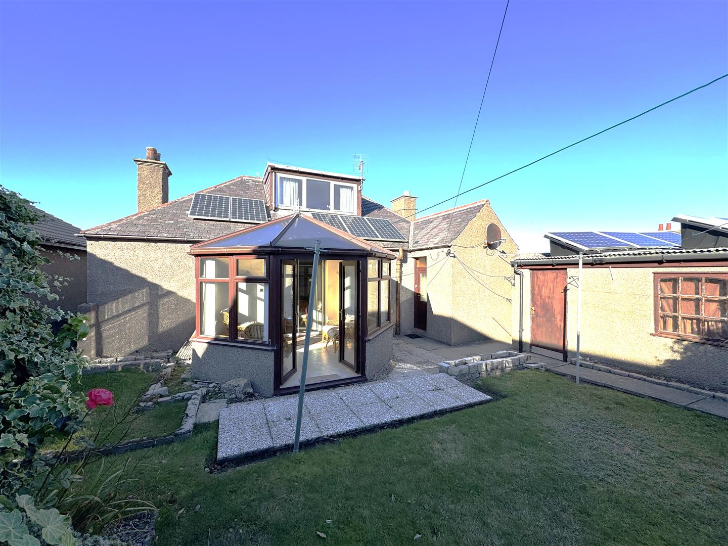 The conservatory features a polycarbonate roof, tiled flooring, and large windows that offer views of the garden and allow for excellent natural light. This connected space provides a peaceful retreat and potential for year-round enjoyment.