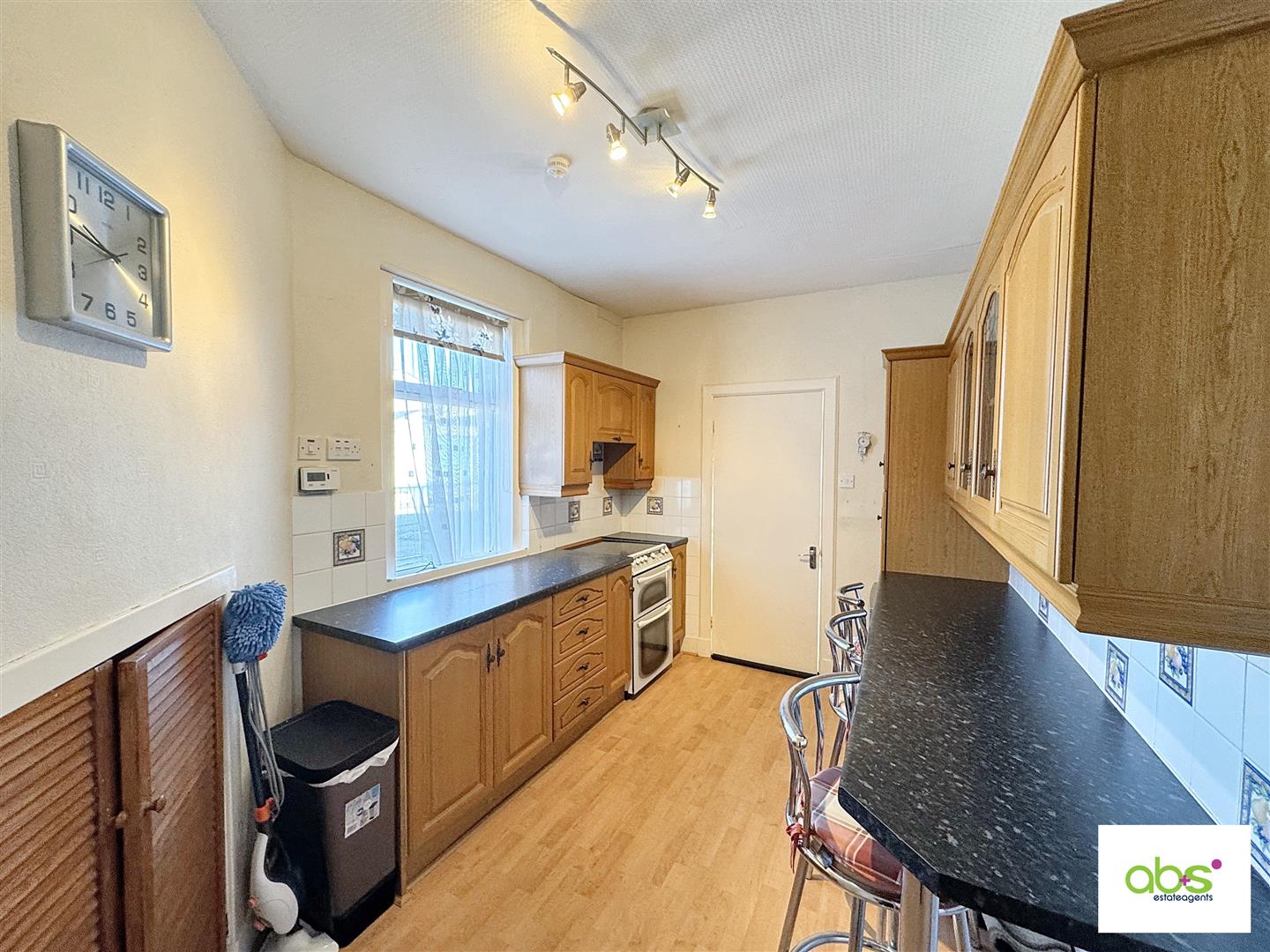 The property features a galley-style kitchen with a mix of traditional and modern cabinetry, offering scope for upgrading. The layout includes a breakfast bar area, tiled splashbacks, and ample worktop space.