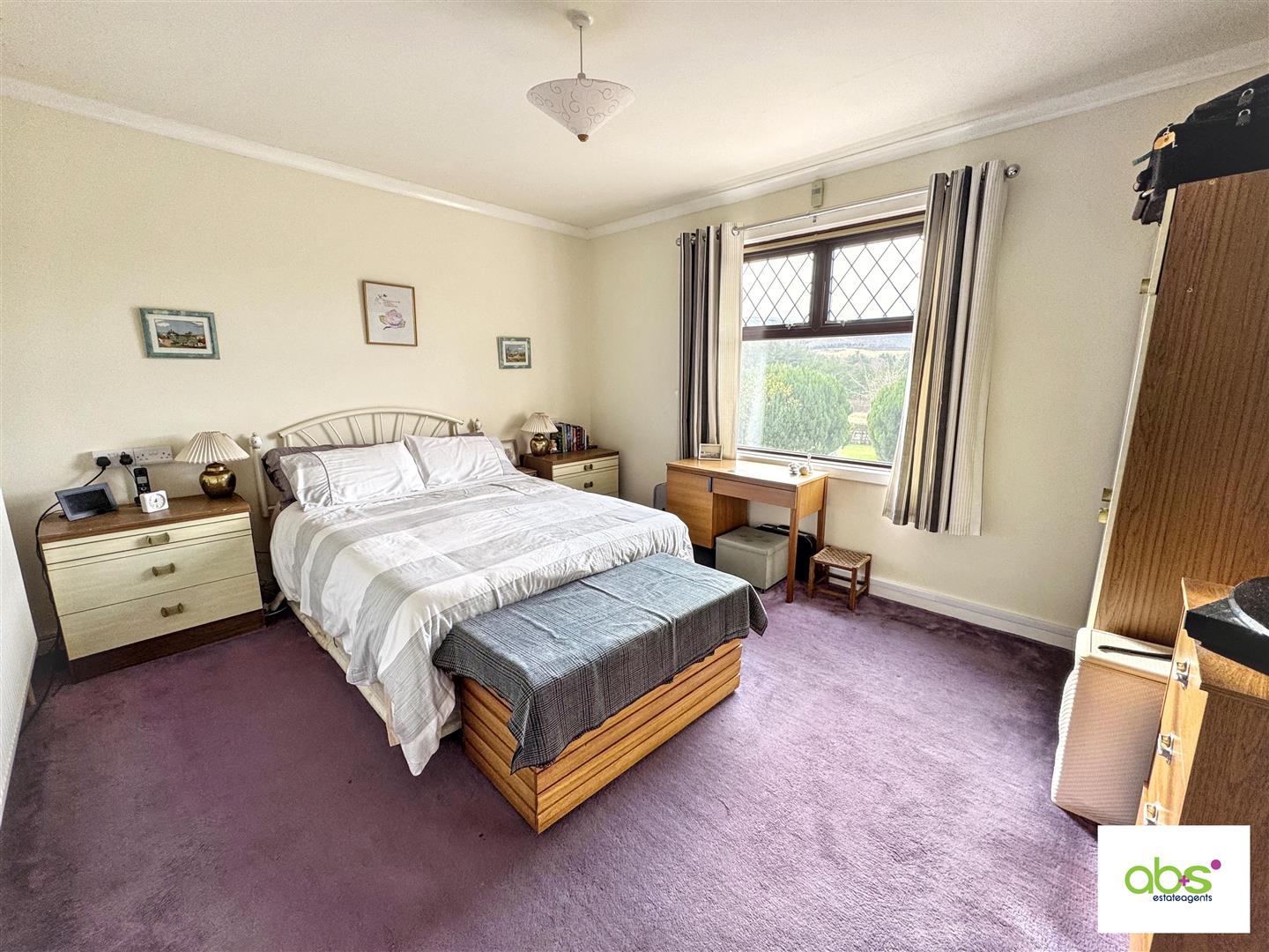 Generous double bedroom with window overlooking the front garden and Ben Rinnes backdrop. Fitted wardrobe, Ceiling light, radiator and carpet.